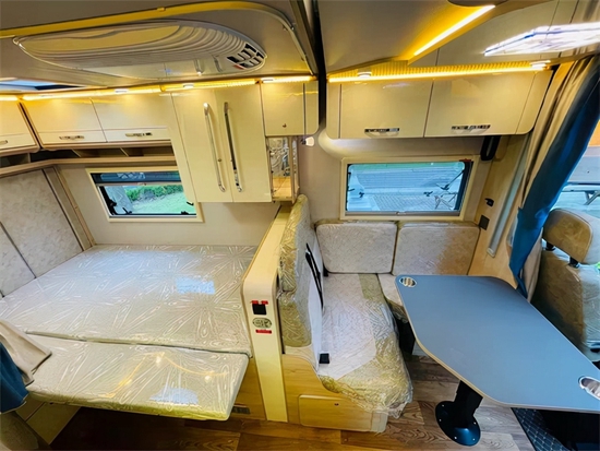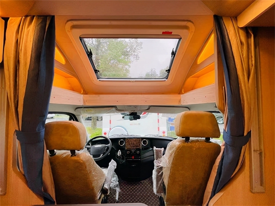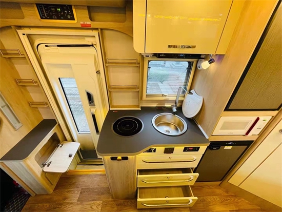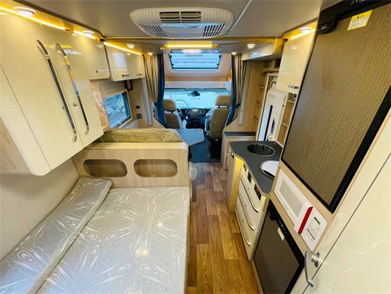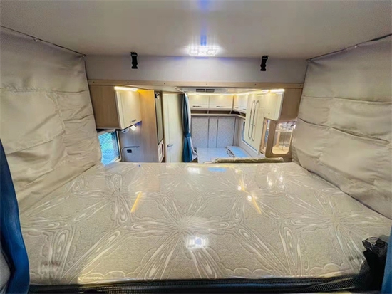 进入给人一种非常敞亮的感觉,这个得益于额头上方的保温全景曲面天窗,当然有利也有弊这个额头和大额头的车型相比少了一张床铺,不过不要担心该车型在会客区的上方安装有一个电动升降床。电动升降床的尺寸为2000×1100(mm),床位两侧均有防护网,儿童睡觉也不怕掉落,而且上下车也很方便。这个车的会客区非常大,驾驶舱座椅旋转过来能够满足我们日常的休息、用餐、会客等需求,家具的整体颜色风格偏居家。除了吊床外车辆尾部设计有一个可拓展的纵置双人床铺,车辆可以轻松满足4个成年人休息,如果出行人数再多可以采用会客区拼床,不过该车型小编建议2-4人旅居使用最为舒适。