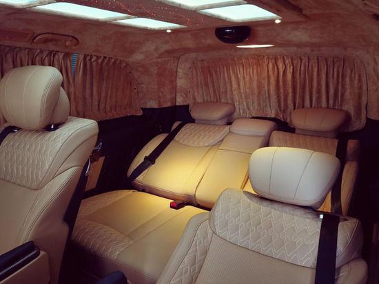 进入后舱,立刻就会被它的豪华绚丽而征服,驾驶舱与后舱是分隔设计的,形成两个独立的空间。中间由一台超大液晶升降电视(32寸)及柚木多功能吧台及柏林之声音响组成,整车环保真皮包裹,金网花地板铺设,豪华感无处不在。全部采用真皮制作,豪华木饰装点,装有按摩加热通风功能。后舱前为两个独立航空座椅,后为一组沙发座椅,可电动展平,形成一张舒适的沙发床,简单实用,提升空间利用率。