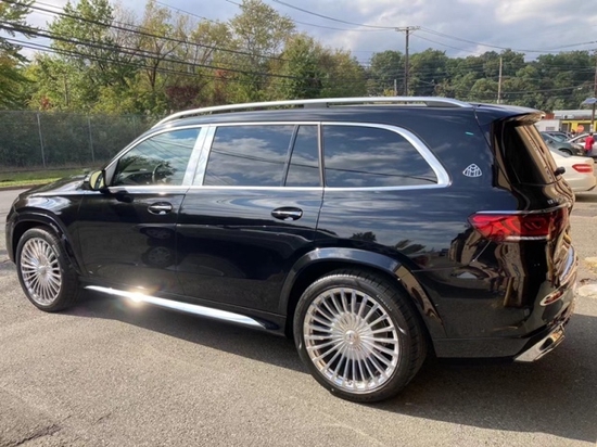 2022款迈巴赫奔驰GLS600车身侧面非常霸气硬朗,双色拼接的车身显得外观更加奢华。车顶配有银色镀铬行李架,并且车窗周围搭配有镀铬饰条的装饰。迈巴赫GLS600的轮毂采用的是超大尺寸的密辐条样式设计,使得整个侧面看上去更加庄重奢华。并且在后车窗的后方还设置有非常标志的迈巴赫logo,凸显了这款汽车非常独特的身份。
