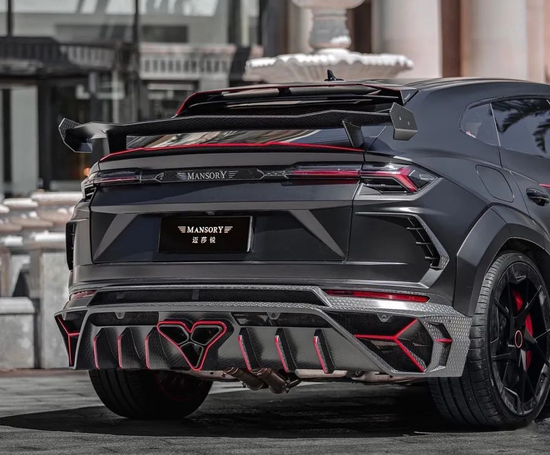 车尾部分,MANSORY迈莎锐为UrusVenatus增加了碳纤维材质的后保险杠、尾翼、后备箱盖扰流、后置扩散器、星形三出排气管、车尾左右侧扰流片以及连接左右尾灯带有MANSORYlogo的碳纤维饰条等......形成了极具冲击力的视觉效果。