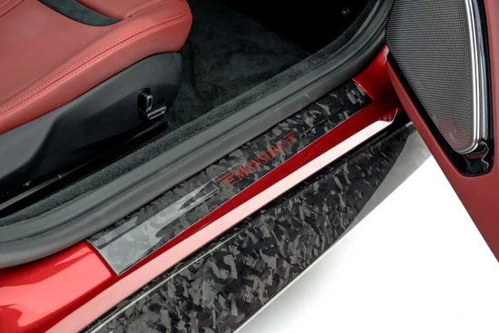 MANSORY迈莎锐之所以被称之为“欧洲豪车定制大师”,因为它不止会做“表面功夫”,即便是不开门便看不见的的进门踏板,也被MANSORY铺陈了同样规格的48K-B锻造碳。中央深红色官方飞翼标识更是将Roma车主的尊贵身份和超凡品味彰显得一览无遗。