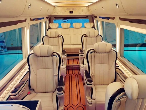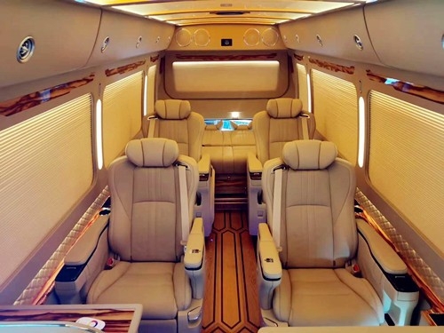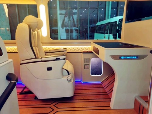 丰田考斯特 (配置|询价)改装在内饰的设计上采用的是豪华版的真皮座椅,座椅有自动调节前后位置、靠背角度以及电动脚托等设置,还可根据自己的需求添加自动加热,北京华通丰业通风的装置,满足旅途需要。除了座椅,考斯特改装还可以从内室的办公设备、车内音响影音设备、灯光、地毯/地板的改装、顶棚及窗帘的设计等方面来打造专属您的高级私人定制商务车。