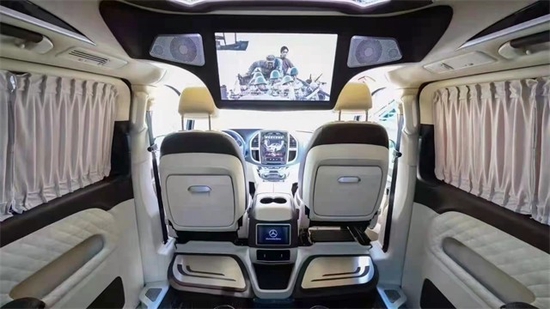 奔驰威霆改装后才用的是2+2+3的布局方式,也是商务车最流行的布局,驾驶室内,这款车也大量采用了真皮来包覆整个驾驶室,另外我们在驾驶舱内的两个座椅中间搭配上车载冰箱,在酷暑的夏季里可以随时喝上冰凉的冷饮。