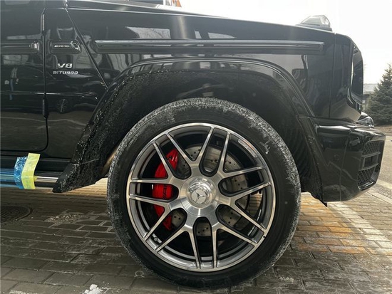 全新G级的车身侧面依旧硬朗,同时车门上的防擦条得以保留,侧翼子板处还有“V8”的专属标识,十辐轮毂搭配红色卡钳,看起来很引人注目。