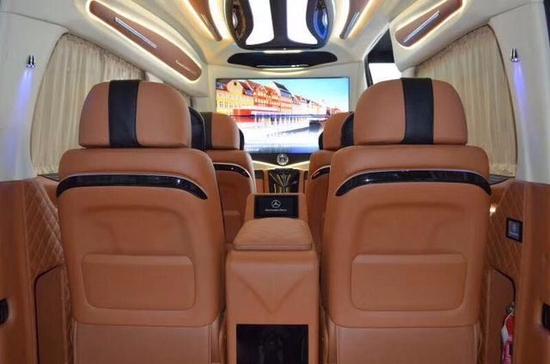 奔驰斯宾特隐藏九座,多功能精致的吧台,大容量的恒温电加热水壶,酒柜和水晶酒杯,DVD及美国顶级bose音响,一键式可升降40寸液晶电视,私密空间随您掌控。豪华深色内饰,高光泽实木饰板,尽力打造奔驰房车的低调与简单之美。奔驰斯宾特隐藏座椅,电动 收展隐藏商务桌板,功能俱全。尽力打造奔驰房车的低调与简单之美。