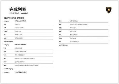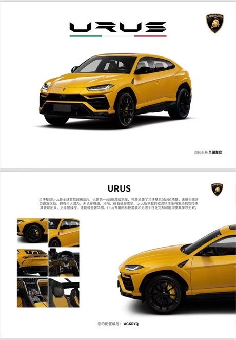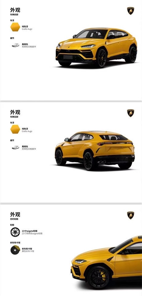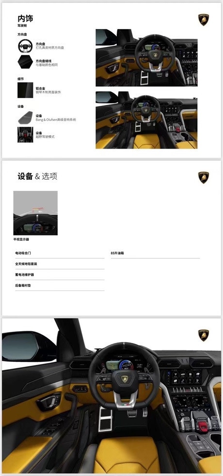 外观:黄色外漆内饰:黑黄(反转缝线)选配:运动风格真皮内饰,真皮材质方向盘,哑光黑色排气管,全景天窗,钢琴木制亮面装饰,电动吸合门,23寸亮黑色轮毂,23寸 PZero轮胎,21寸备胎,黄色刹车卡钳,平视显示器,越野驾驶模式,B&O音响,Q-citura缝线,座椅头枕上的兰博基尼盾形刺绣标识,带有座椅通风和按摩功能的全电控前排座椅,前后标配地垫。