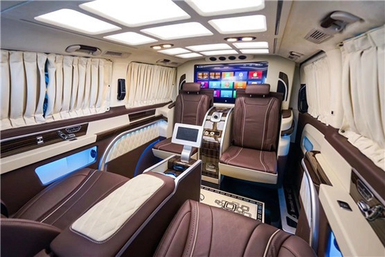 奔驰威霆房车车身尺寸为:5370*1928*2080mm,,使车内空间更高,坐在车内不会有压抑的感觉。加长3400的轴距,不止是大空间内舱的最直接体现,更为舱内的升级提供了优良的底盘基础。这台4座定制版的威霆内饰非常有特色,车舱内部米白色与蓝色的内饰搭配,大量真皮包覆车壁,地板也采用了经典商务车改装所运用的柚木地板,亮白的星钻氛围灯,带来豪华高雅的氛围。