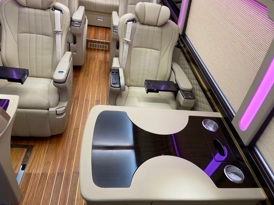豪华高档办公桌以桃木及真皮为材料,打造最舒适高端使用的办公环境。360度可选装首长席,双人汇报席,方便旅途中的您进行紧急会议,舒适的座椅,实用的办公设置,贴心的电源以及显示屏设置,考斯特高级改装于细节之处展现尊贵风格,在平凡之体现贴心设计。