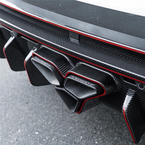 奥迪RSQ8 Mansory迈莎锐定制版,亮光灰搭配红色拉花。外观套件经过升级,Mansory为RSQ8新开发了和Mansory URUS同款的碳纤维后唇和中出排气系统。