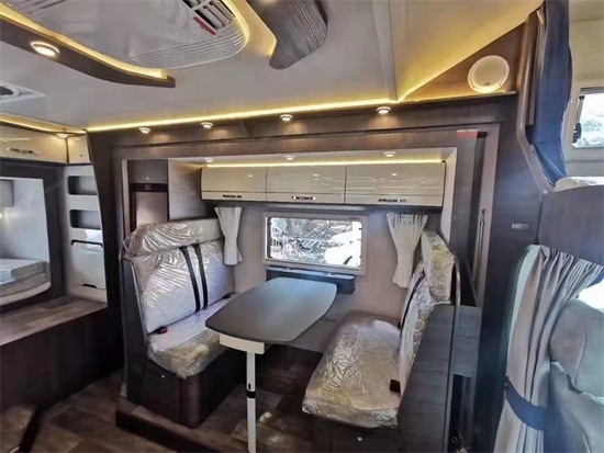 车身外装德国进口房车专用乘客门(带纱门),合世壁房车专用双层亚克力玻璃保温车窗,三乔房车专用行李舱门,美国进口MAX天窗,意大利进口菲亚玛(FIAMMA)遮阳棚。同时他还能满足六座六卧的需求。