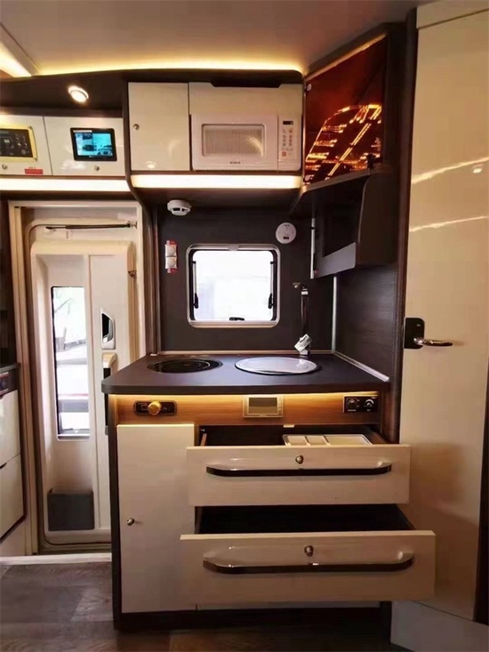 同时暖黄色的木纹装饰,车内明媚灯饰,布艺沙发、茶几吧台交相辉映,是饭厅,也是会客厅,聊聊天、吃吃饭、喝喝下午茶,不知道有多轻松惬意。车内电器配置有滚筒洗衣机,微波炉配置,电热器,空调、暖气、说是小型式样的房子,完全不过分的。角落的卫生间,依旧尽职尽责,履行它的光荣使命。