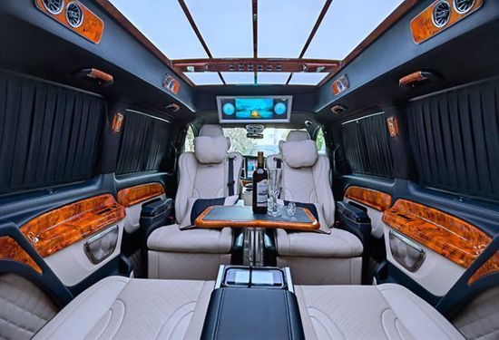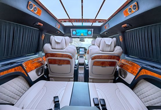 奔驰威霆改装高顶无隔断7座商务车,奔驰VITO商务改装车是在奔驰威霆裸车基础上进行改装,14寸显示屏。主副驾驶以及侧门进行软包,进行隔音处理,以降低车内噪音,奔驰威霆改装无高顶无隔断7座商务车主副驾驶冰箱换成超大11L制冷冰箱,最低可达零下18度。
