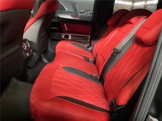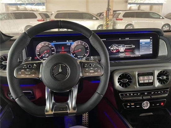 2021款奔驰G63主驾驶正前方的三幅式多功能方向盘采用平底造型,两侧使用打孔真皮,细节处搭配红色缝线以及AMG专属LOGO。数字采用单独分开的形式,突出了AMG独有的模拟时钟别具特色的IWC设计。数字和指针均采用精炼纯金属材质。双12.3英寸高清显示屏仪表盘中的信息能够以不同格式显示在双12.3英寸高清显示屏中,3种显示风格可供选择,可更生动地显示车辆功能信息。