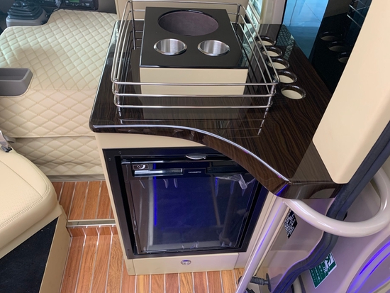 从内饰上来说,丰田考斯特改装版从座位的布局上采取了后排座位数为四个,中间三排采用左二右一的的布局,前排为豪华首长席,并且配备办公桌以及固定秘书桌。在上车门的右端安装并向设备,主驾驶后有隔断分离。如此设计,乘车空间宽敞,设计贴心,豪华的办公桌椅带给我们不一样的乘车感觉。人们总说高贵的人会步步登高,其实脚下的装饰对于彰显我们的身份是十分重要的。