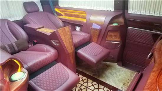 奔驰V260改装红木总裁版贵宾舱装饰极其奢华,宛如皇家宫殿,舱内采用大量缅甸黄花梨装饰,并纯手工打造精美雕花,古色古香,奔驰V260商务车又仿若一方富甲书房。奔驰V260红木总裁盛世祥云版设计理念为高端人士商务用车之选,内饰科技感十足,座椅采用4+2隐藏六座设计,在车身长度5370mm的基础上更充分利用车内空间,在32寸电视周围用黄花梨木进行装饰,第二排座椅采用的是GL450反向座椅,可语音控制电动调节。指纹式保险柜,隐藏式ipad电脑,车内饰烟灰缸,全部都用红木和鳄鱼皮进行打造,细节,工艺,无不体现此车内部的豪华程度,更有车载WIFE,电子狗等系统。