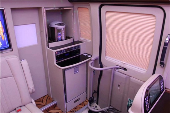 丰田考斯特超VIP尊贵版新配备了专用车载冰箱,3个顶置长型荧光灯;此外,新增行李箱的灯等为用户夜间存取行李提供了方便,凸显出人性化关怀的设计,丰田考斯特12座是典型的日本车设计,没有什么大的缺点,主要以方便、美观、实用为主。