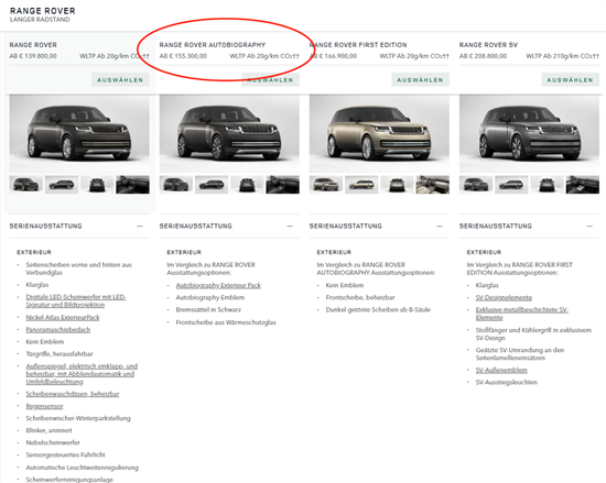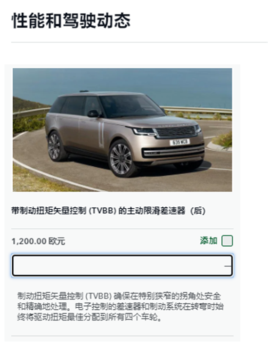 中规版本全新路虎揽胜还全系标配了4轮转向以及制动扭矩矢量控制的主动限滑差速器(后),而长创这个配置为选配,1200欧, 不知道买车的客户会不会买单,车商会不会为了多花8000元左右选择这个配置。
