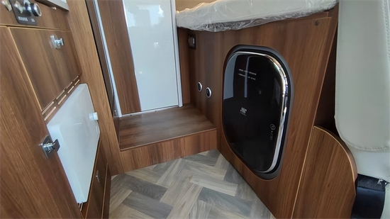 进入车厢,不得不说这款房车内饰设计和配色着实让人眼前一亮,既温馨又有质感。虽然这款房车没有拓展机构,但内部整体空间表现中规中矩,不算宽敞,但绝对够用。因为是小额头房车,所以并没有额头床,取而代之的是大尺寸天窗和储物格,此外还有一台29寸液晶电视。会客区采用了L形沙发+单人座椅+升降餐桌的布局,座椅采用了符合人体工程学的沙发座椅,支撑性更好,保证了长途旅行乘坐的舒适性。