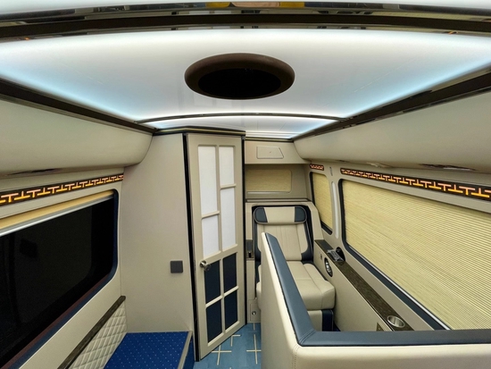 从内饰的改装上来说,这就有很多细节的设置了。从灯光的设置上就有很多种方式,我们可以在车顶内加装豪华的彩色灯,可以有橙色蓝色紫色等不同的灯光选择,营造车内氛围。窗帘内侧可以加装LED蓝色灯光,车内立柱加装LED灯光,台阶上也可以镶嵌LED灯光,显示品牌坐标等。同时还可以在通道来两侧增加LED蓝色灯光。我们都知道,光是最能衬托氛围的选择,对车内灯光的改装可以带给我们独特的视觉感觉,营造出或温馨或者淡雅的乘车环境。