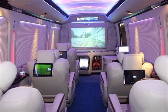 丰田考斯特改装商务车在内饰的舒适度上付出了很多的心血,在内饰的美观上,丰田考斯特改装商务车也是充分体现出了自己的与众不同。丰田考斯特改装商务车车内饰的百褶窗帘或者是布艺窗帘,既能够带给我们舒适之感也让车内的设计显示的更加独特。丰田考斯特改装商务车在车内的地毯的选择上也增加了许多方案,游艇木地毯的整体舒适感,通道地毯的尊贵和舒适感。