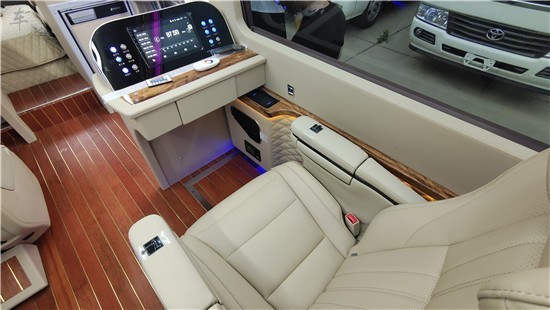 从灯光的设置上就有很多种方式,我们可以在车顶内加装豪华的彩色灯,可以有橙色蓝色紫色等不同的灯光选择,营造车内氛围。窗帘内侧可以加装LED蓝色灯光,车内立柱加装LED灯光,台阶上也可以镶嵌LED灯光,显示品牌坐标等。同时还可以在通道来两侧增加LED蓝色灯光。我们都知道,光是最能衬托氛围的选择,对车内灯光的改装可以带给我们独特的视觉感觉,营造出或温馨或者淡雅的乘车环境。