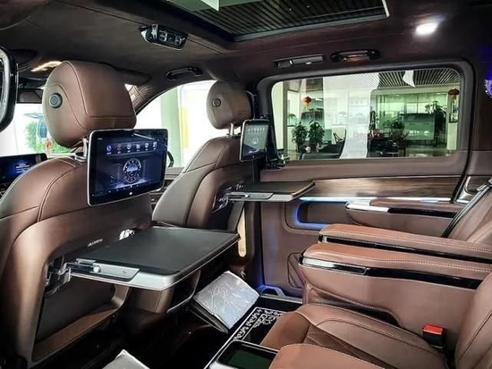 一般豪华的奔驰都是有后排娱乐系统的,这款奔驰七座商务车为了充分考虑后排人员的娱乐体验,在正副驾驶座椅头枕后方设计了独立的车载办公电脑,需要的时候开启,后舱人员独立使用,加上独立办公小桌板搭配起来非常实用,一点都不浪费空间。