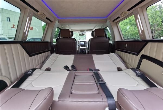 全车隔音、隔热、降噪处理,内舱安静私密,适合商务谈判和自驾出行。后尾箱与车体相连,形成一体式车厢,同时加装附带加热、通风、按摩,前后移动等多项调节功能的中排航空电动按摩椅与可180°平放成床的后排三连真皮沙发椅。