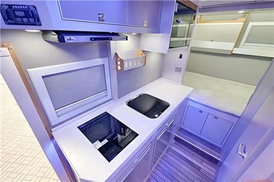 厨房区实木组合式橱柜采用分区域布局设计,由乘客门隔开,不同的功能相互呼应的同时也让做饭井然有序,橱柜推拉式抽屉便于存放日常生活用品及碗具。其它方面配备触摸式集中控制系统+机械式翘板开关、液晶电视、小米盒子、日本YAMAHA八喇叭音响系统(带低音炮)、抽油烟机、微波炉、西门子电磁炉、152L赛特福德房车专用冰箱、大宇3kg洗衣机、特鲁马燃油暖风热水一体机、四路监控、一氧化碳/烟雾报警器等。室内多个220V、12V电源插座及USB充电接口可满足日常充电需求。