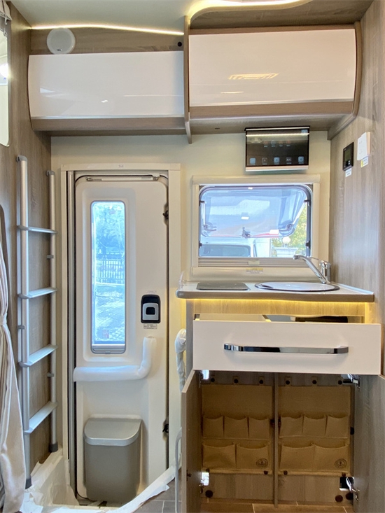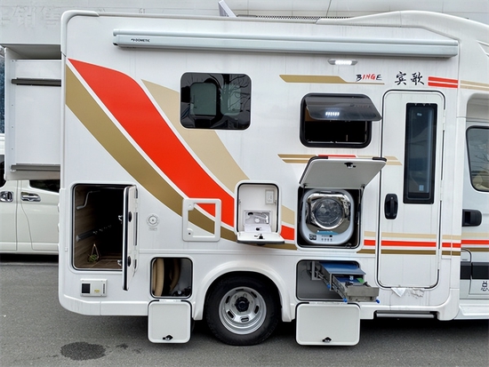 整车采用全铝合金骨架,比传统箱体轻10%,结构采用拉铆工艺,强度可靠。车身右侧功能齐备,装置有洗衣机、水路过滤器+低噪水泵、外置冷热调节淋浴、外接电源插座、户外抽拉式燃气灶、气罐舱(带安全阀)、室外餐板、电动踏步、多美达遮阳篷、整车门锁、超大贯通式储物舱等。尾部的大力支腿,能保证车辆停驻时不摇晃不抖动,让车身稳定,如履平地。
