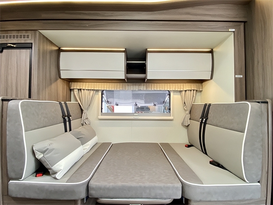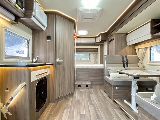 益于双拓展设计,宾歌CD520房车整体空间非常宽敞,整车布局清晰,由前往后依次以驾驶室、额头床、会客区、厨房区、卫生间、睡卧区。家具选用浅色轻质环保板材,加上明亮灯光点缀,倍感温馨。会客区采用双人对座卡座布局,中间配有升降桌。会客区正好处于左拓展舱处,如果想要更大的活动空间,可以在车辆停驻之后,将拓展舱展开。座椅不用时候,可将升降桌下降,拼成一个1870mm*1020mm的单人床铺。