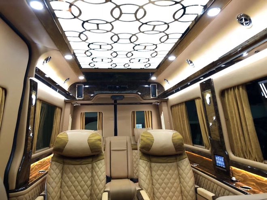 奔驰斯宾特云锦版全车2+2+2+3座椅排列顺序,前排首席是两个顶级配置的总裁航空座椅(通风 加热 按摩 腿托 座椅记忆 座椅一键式还原 前后移动),扶手处采用澳洲鸵鸟皮,头枕、靠背处采用了造价昂贵的云锦装饰,古老的东方艺术,结合奔驰的现代工艺,将奢华推向极致。两分式棚顶设计,前部分为中国风铜钱灯,后部分为璀璨星空,全景式顶灯投射下,浪漫紫色,搭配豪华游艇钟装饰,无与伦比的视觉盛宴!
