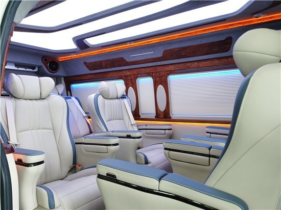 这台海狮整车升级了加强型的隔音隔热处理,车内带空气净化系统,无线充电系统。在进门侧加装了氧化铝脚踏带迎宾灯的,整车都是采用纳帕级皮质进行包覆的,侧壁红木装饰,手动百褶窗帘,后舱暖风系统,最后说说棚顶灯光,这个有智能触摸控制系统。灯光超级棒。