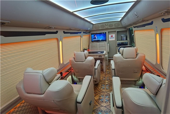 是丰田柯斯达12座商务接待版,这款车相对于以上两款,视野更好相对的隐私性稍显不足。这款车更适用于大型企业团队出行,双人对坐汇报席、进口埃尔法航空座椅和高端定制桃木办公桌构建的商务办公场所基础上,车内还加装了一个吸顶式高清显示屏和升降式高清显示屏,空间的最大化利用的同时更凸显了这款车的视野优势。