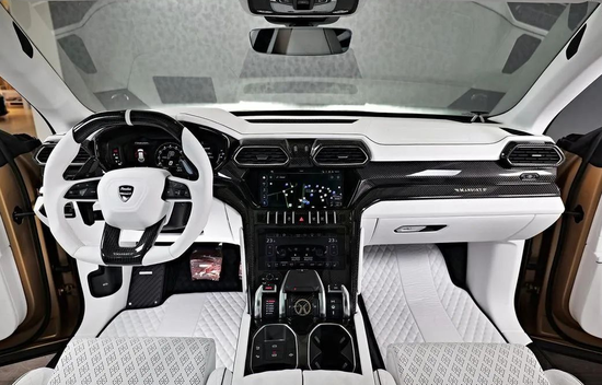 MANSORY迈莎锐改装下的兰博基尼Urus气场强大,不怒自威,战斗气息满满,黑色碳纤维被灵活运用,从前脸引擎盖一直往下,经过格栅再到前铲部分,一番改造之下,兰博基尼Urus展现出更多的运动感,视觉效果上大有层层递进的升级感。高级锻造碳材质让整车现代未来感极强,它应该置身于某部美国大片,那样才符合整车的定位。