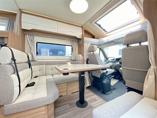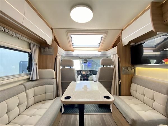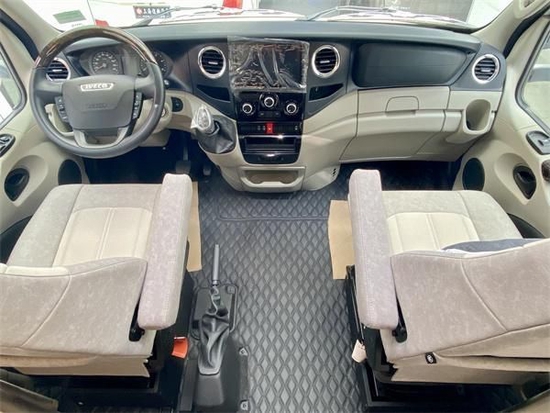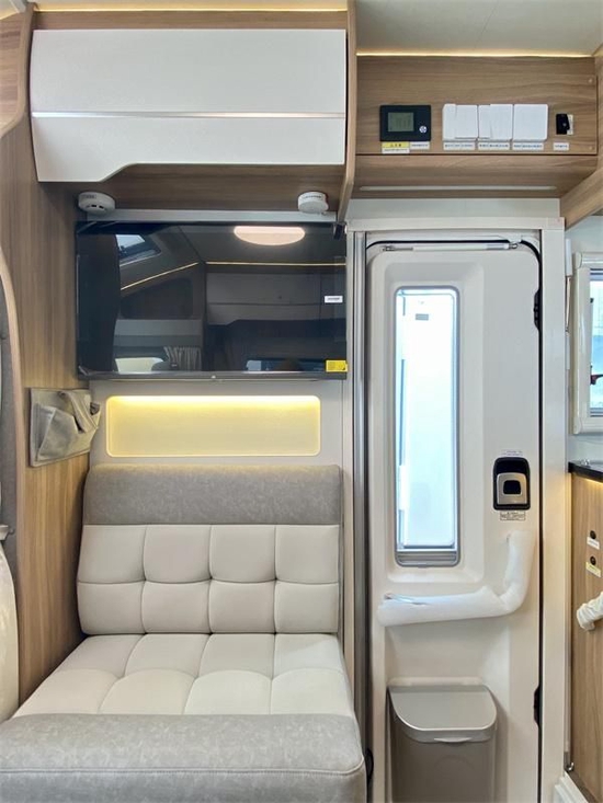 来到车厢内部,整体感觉非常的通透,内部的装饰风格也非常的豪华大气,车内还采用了独特的平面地板设计,免去了上下台阶的不方便,也可以避免老人小孩在这里意外跌倒,日常使用更安全。豪华正副驾驶座椅,副驾驶座椅可旋转,后仓L型座椅+单人座椅,采用高级磨砂皮料包覆,秒变2000*1400mm的L型沙发床,空间灵活变动。