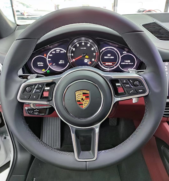 来看内饰设计,保时捷卡宴的内饰采用的是酒红色的氛围,豪华感,运动感都凸显得相当的不错。中控部分搭载的是12.3英寸的液晶屏幕,行车电脑屏也同样搭载的是炮筒加数字液晶屏。有意思的是,机械仪表设计在了中间,两侧则采用的是不规则的数字液晶屏,这样的设计是比较少见的。