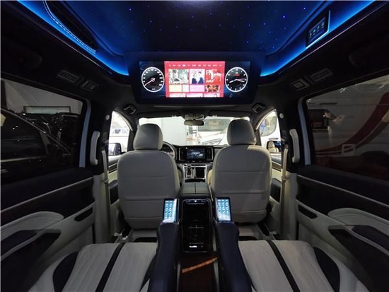 蓝白相间的超细纤维真皮内饰设计极为舒适,极具观赏性,腰线覆以高级麂皮,做工精致,整车隔音降噪,健康舒适的驾驶环境,后舱独立车载电视带影音系统,8.1立体声环绕音响,让您在车内享受影院级影音系统。