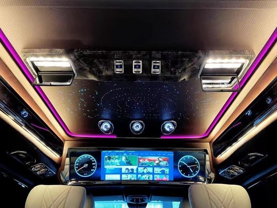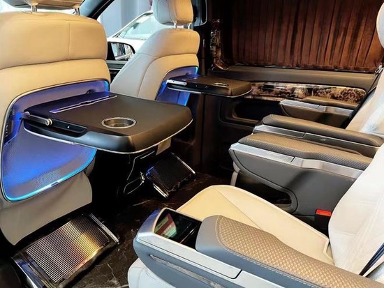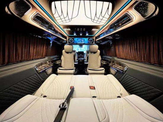 全新奔驰威霆2+2+3座椅陈列,也是商务车最为流行的座椅布局,第二排航空座椅,打孔真皮处置更透气,座椅透风、推拿赐与您更温馨的乘坐感触,更有360度扭转功用;奔驰威霆7座商务车无论是家庭出游照顾孩子、陪家人谈天,亦或是商务洽谈,都能让您随心所欲。在奔驰威霆主副驾驶座椅后方安装有手动小桌板,可承重10公斤,文娱影音配备齐全,24寸高清固定式液晶电视,需求时可随时开启,配合进口丹拿音响,这就是传说中的移动家庭影院,最主要的内饰就是座椅。在改装后奔驰奔驰威霆车顶设计上也富有层次感,灯光采用碎钻搭配,使整车内部空间氛围温馨且大气,而且在造型上也是亮点突出,三款时钟搭配,无时无刻都在彰显奔驰威霆改装商务车高顶版的豪华非凡。