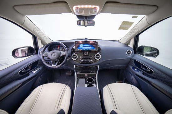 再看这款奔驰威霆7座商务车的驾驶舱,非常简约实用,杯托、无线充电,扶手冰箱都是非常人性化的标配。