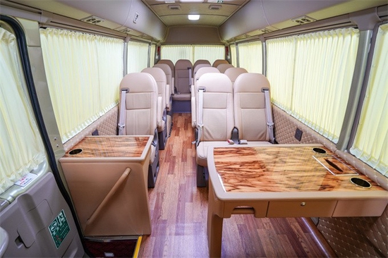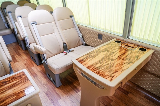 丰田考斯特在改装的时候一般都比较讲究,比方说司机操控台一般都是桃木内饰设计,司机的座椅采用了加宽加大的设计,另外加上扶手,大大提高了美观性跟操控的舒适性!乘客区域的座椅一般都是这么设计的,首先主要领导位都采用了航空首长席座椅并且配有办公桌,所有陪同人员的座椅都采用了加宽加大加厚加扶手的设计!并且都配有进口真皮!看上去大气,坐上去舒服!