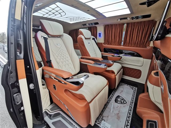 航空座椅:奔驰威霆乘客舱第二排多功能航空座椅,可180°旋转,并带有脚托功能,舒适乘坐,附有加热、通风、电动调节、腿托、按摩、记忆、电动头枕、电动靠背、电动肩部支撑等功能,座椅支持180度旋转。此款奔驰威霆第二排与第三排之间有可拆卸便捷式商务桌板,可进行商务洽谈,商务洽谈可放置电脑、文件等物品,旅游无聊时打牌,宜商宜家。