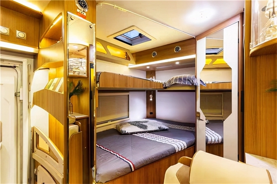 进入车内被这款房车金碧辉煌内饰的气势所震撼,在灯光的映射下,白色烤漆柜门以及晶莹剔透的玻璃门都在闪闪发亮,无处不彰显奢华。车内家具选用环保板材,地面铺设的是环保阻燃地板革。拓展舱打开后,内部空间极其宽敞,可以供一家人舒适生活,内顶安装了美国进口MAX十速双向的换气扇。