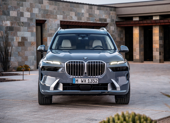 最全新宝马X7 (配置|询价)官方定妆照出炉,果然双肾进气中网又有扩大,不过没有宝马4系那么夸张,整体是能够接受的程度,而且由于SUV车身看起来就比较粗壮,所以大鼻孔也更协调一点。两侧大灯组合发生了较大变化,原来所谓的宝马天使之眼大灯现在竟然变成了双眼皮,上半部分是眯眯眼日行灯带,下半部分则是隐藏式矩阵远光灯。