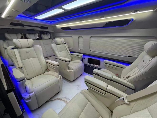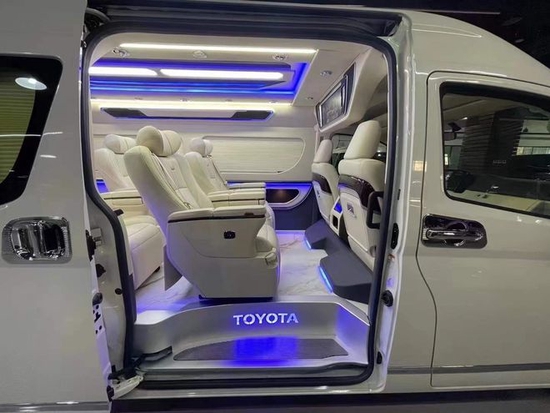 3.5V6进口丰田海狮9座对驾驶席的座位改装上也采用加大加宽加厚的设置,3.5V6进口丰田海狮9座内饰配置:DVD智能显示器、扶手箱触控大屏,卡拉OK系统、导航、倒车影像、仪表实木内饰、全皮软包内饰顶棚