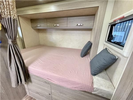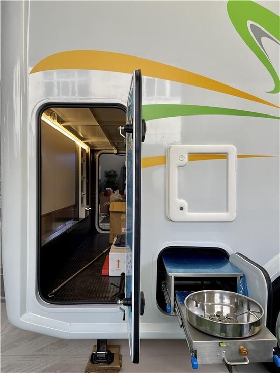 内部采用了E0级的环保板材,整车无异味,装饰看上去更为舒心;额头区配有电视以及额头床方便我们娱乐的同时又提供休息区域;没有配备天窗是为了做到极致的保温;会客厅部分采用对坐式卡座同时配有外置桌板以及衍生板凳,满足我们六人同时的吃饭;会客区上方配有4个吊柜,同时我们的卡座下方也可以进行储物,再搭配我们尾部的储物仓让我们拥有近2500L的储物空间。