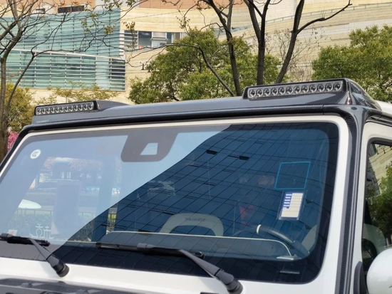 由车头可见,MANSORY迈莎锐使用大量材料领域“黑色黄金”—T200航空级碳纤维为G63打磨出一个宽体大包围用于增强前脸霸气指数;全碳引擎盖带进气口质感满满吸睛夺目,碳纤维强大的耐高温及导热属性可保障车辆长途跋涉后机盖依旧温热不烫手;此外,前唇、前保险杠分离器、格栅框、LED示廓灯罩、车顶探照灯等部位都以可视碳纤维材料做了替换升级,就连雨刮器和车标等小件也是碳纤维所打造,MANSORY还是日内瓦车展那个“无碳不欢”的高定王者。