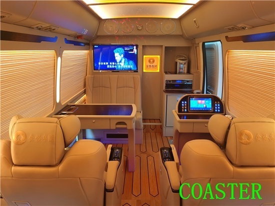 丰体考斯特13座改装在内饰的设计更加专业化体贴化,追求完美的舒适之感以及视觉上的舒适享受。从座椅的改装商来说,我们可以根据自己的需要选择豪华版真皮座椅也可以选择织物座椅,座位的数量也可以根据我们的需要进行调整,我们都可以根据自己的需求进行改善。同时我们可以对座椅进行改装。增加电动脚托,给我们的腿部一个舒适的支撑减少旅途中的疲劳。
