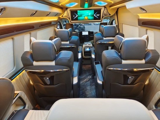 2022款丰田海狮外观到内饰都经过了全面的升级,皇冠版大包围提升外在气势,内饰从驾驶室到后尾门,看的到的地方都采用进口真皮包袱,两侧电动升降窗帘由触控屏控制,前排吸顶宽屏电视多媒体系统,配备JBL高级音响。铝合金地板上面座椅2+2+2+3布局,独立的四张座椅均采用了进口航空座椅,后面则是可电动放平的沙发床,可以想象它的舒适度有多好。