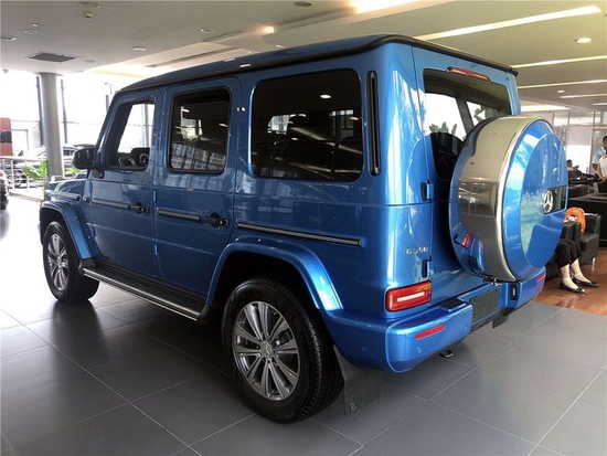 新车的尾部采用了非常方正的轮廓设计,黑色的小书包的外圈采用了黑色的涂装,它的底部包围也采用了黑色的风格,整体看起来和奔驰G500暗夜特别版车型没有什么大的区别。在蓝色奔驰G350车型的旁边的黑色奔驰G级 (配置|询价)也是一款G350版本的车型,它的外观细节和蓝色车型不同,它的备胎上采用了银色的涂装,车轮毂也采用了银色设计!