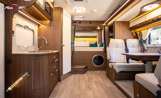厨房区在这一代新车上最大的变化是取消了固定电磁炉,改为移动式电磁炉,方便在车外使用。新增了额外的翻折桌板,架起了中门和厨台之间的桥梁,可利用空间增大。带盖板的洗菜池,顶部吊柜以及微波炉等都是该车的标配。